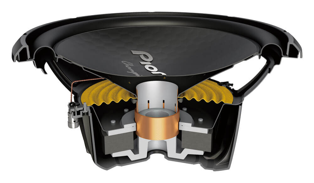 Seamless large cone and magnet cover like the TS-W312S4/D4. Push terminals for easier installation.